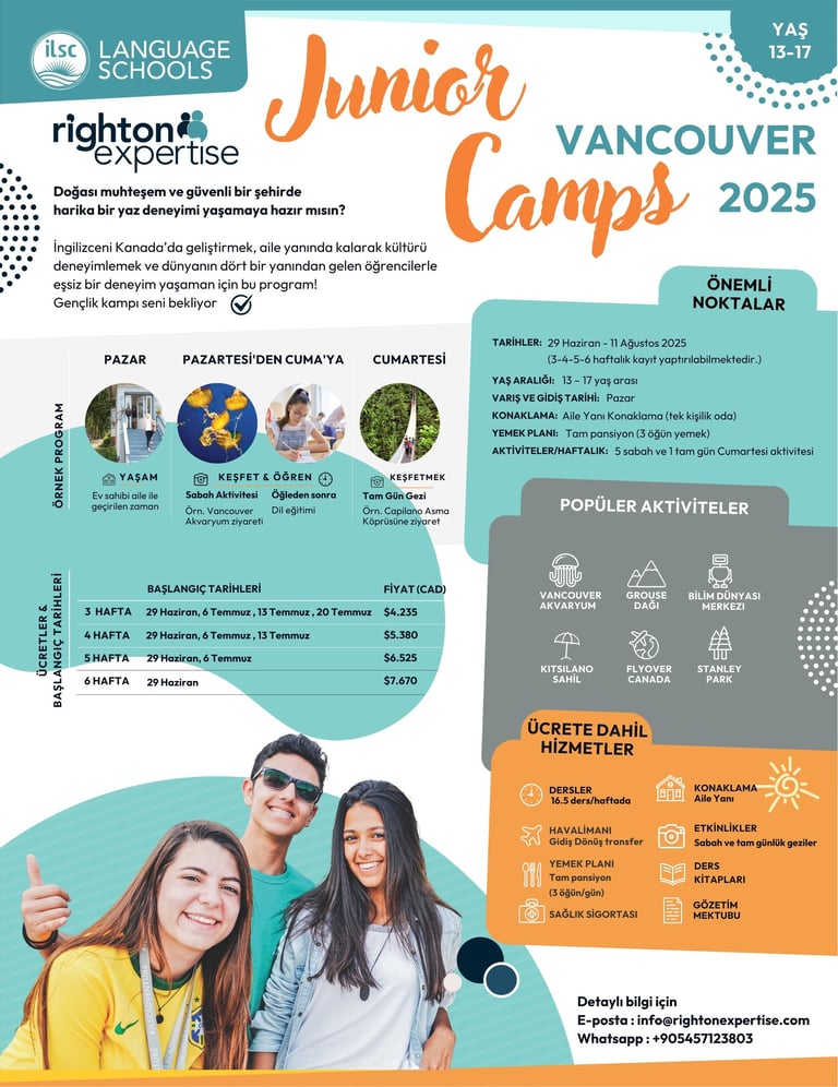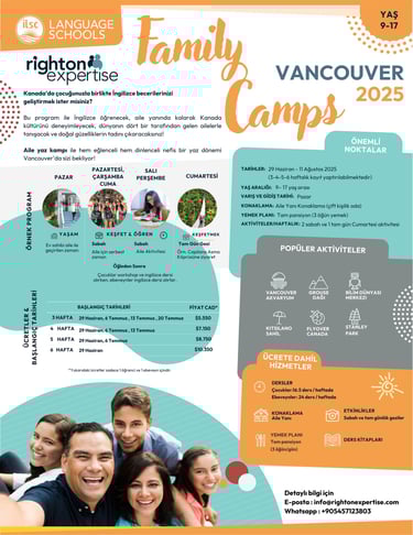 Kanada'nın eşsiz doğası ve çok kültürlü ortamında, dil eğitimini unutulmaz bir yaz macerasına dönüştürmek ister misiniz? Righton Expertise olarak, hem aileler hem de gençler için özel tasarlanmış yaz programlarımızla yanınızdayız.