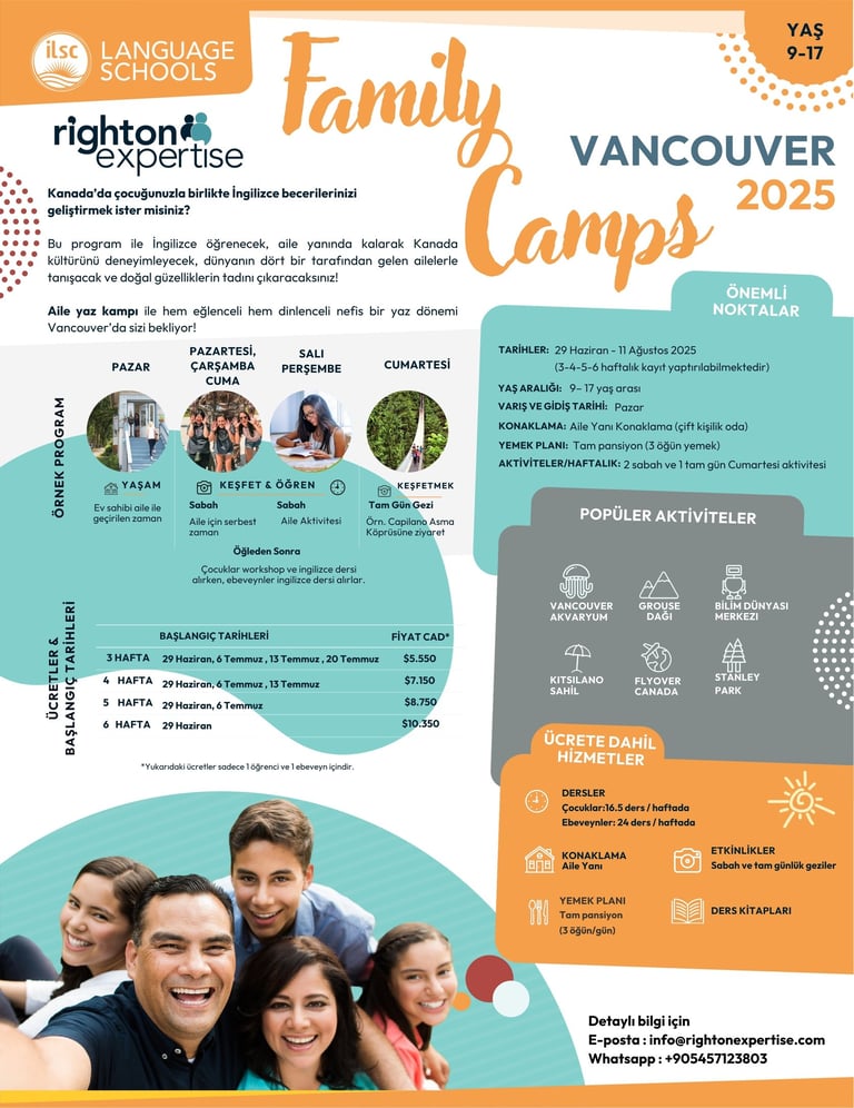 Çocuğumla birlikte Kanada'ya gidip İngilizce eğitimi almak, birlikte eğlenmek ve Kanada’nın nefes kesen doğasında harika bir deneyim yasamak istiyorum diyen aileler (Aile kampı : 9-17 yas çocuk ve ebeveyn) veya bu yaz Kanada'ya gidip İngilizce öğrenmek, yeni yerler keşfetmek ve tüm dünyadan arkadaşlar edinmek istiyorum diyen gençler için (Gençlik Kampı: 13-17 yaş).